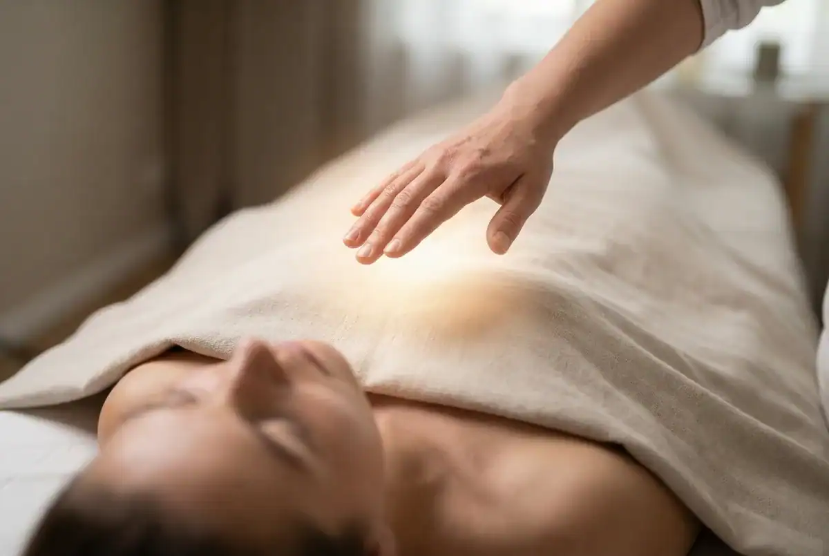✨ Energetikai harmonizálás – a metamorf masszázs során a masszőr keze a test felett lebeg, aktiválva a szívcsakra területét.